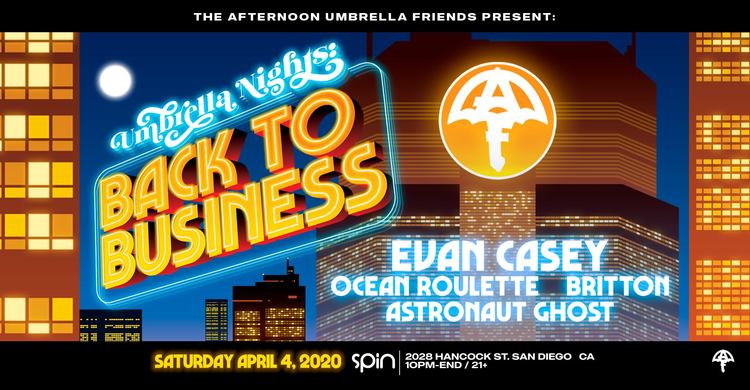 Here at The Afternoon Umbrella Friends, we are all about synergy. And we could not think of a better way to synergize with YOU, our valued customers, than by undergoing a major paradigm shift. So we're bringing Umbrella Nights back, and it's going to bigger and better than ever. That's right, we're going to the one and only Spin San Diego. 📈⚡️