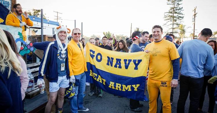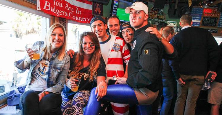 March On festivities from PB Fish Shop - 2019 Beat Army Shirt - Signature PB Shore Club Navy Drinking Glove